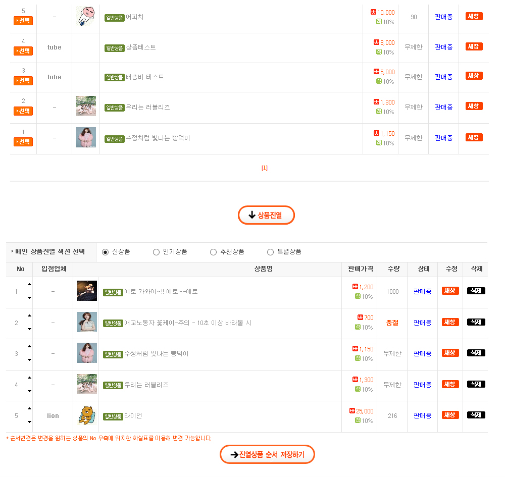 1.상품진열 섹션 설정 및 순서관리