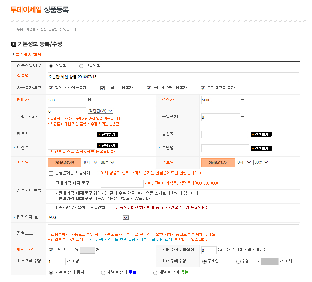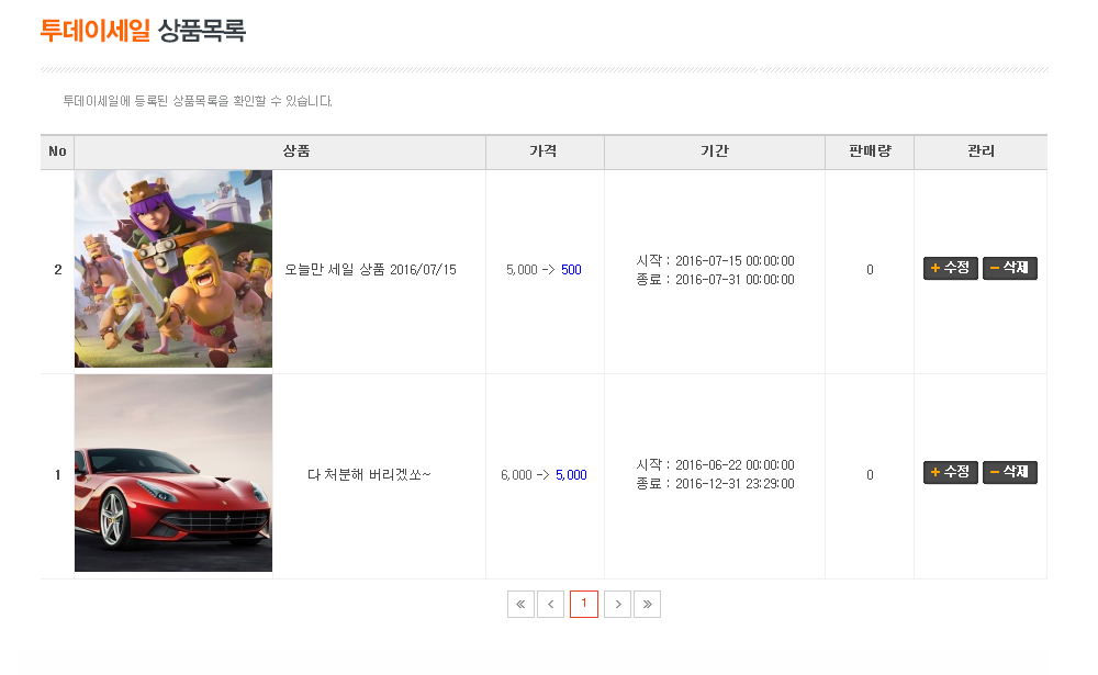 투데이상품 등록 관리모드에서 보기 >