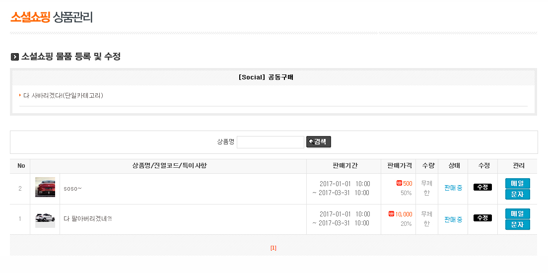 소셜쇼핑 상품 관리모드에서 보기 >
