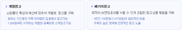 | 상품을 하나씩 구매하는 개별광고 구매방식과 4주간 다양한 광고를 활용할 수 있는 패키지광고 구매방식이 있습니다. |