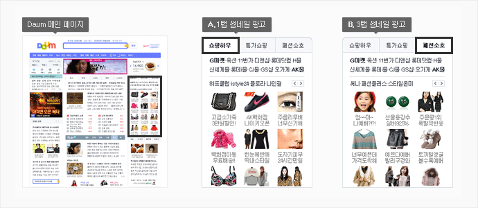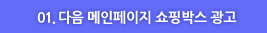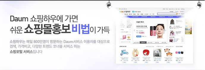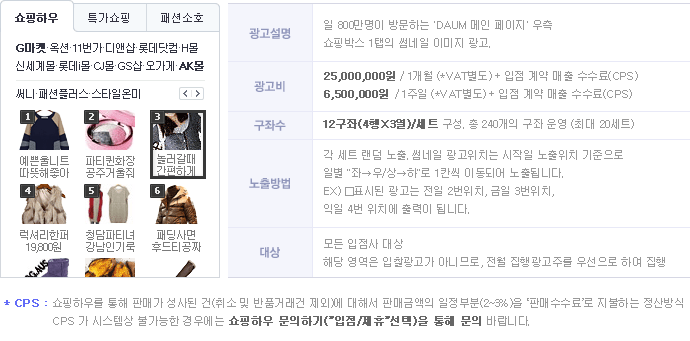 주간 650만원, 월간 2,500만원의 광고비로 원하는 상품을 마음껏 홍보할 수 있는 Daum 메인 쇼핑박스 썸네일 광고! Daum의 쇼핑박스 광고는 입찰에 의해 광고비가 결정되는 방식이 아닌, 고정 광고비로 진행되므로 보다 안정적으로 운영할 수 있습니다. 뿐만 아니라 광고의