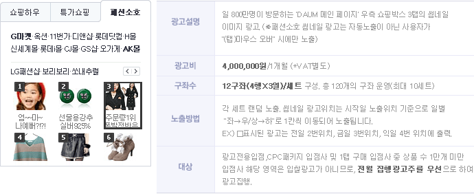 주목도 높은 형태로 몰명을 광고 주간 안정적인 쇼핑몰 홍보가 가능함 |