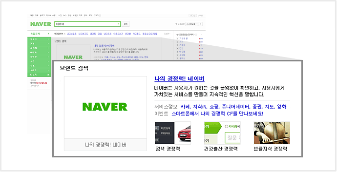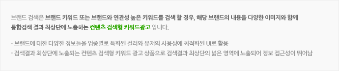 통합검색 결과 페이지 최상단 영역 단, 사용자의 검색 의도가 달라졌을 경우, 브랜드 검색 상단에 언제든지 컨텐츠 검색이 노출, 이에 따른 광고 집행 중단 가능 |