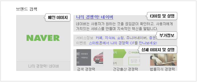 | 브랜드 검색은 메인 이미지, 타이틀, 설명, 부가정보, 상세 이미지 영역으로 구성됩니다. (각 영역 별, 전체 또는 부분 링크 포함) |