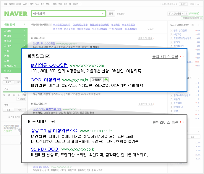 2) 사용자 반응에 따라 파워링크, 비즈사이트의 광고영역을 포함한 서비스 영역( 지식IN ,사전, 이미지 등)의 노출 위치 결정