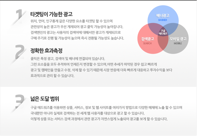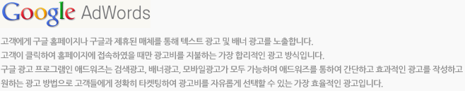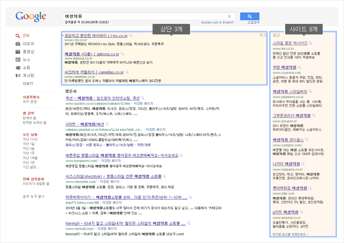 구글 및 파트너사에 검색 결과 동시에 노출 (구글 내에서는 상단 3개 사이드 8개 노출)