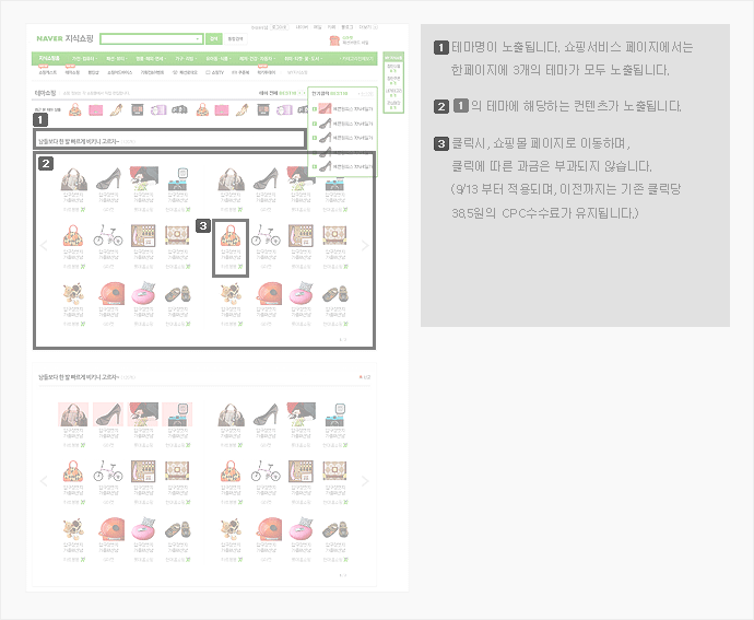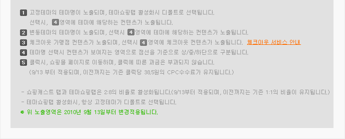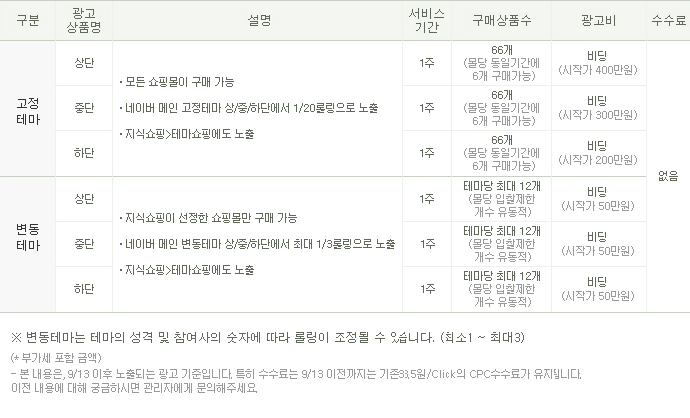테마쇼핑 광고상품은 크게 고정테마와 변동테마로 구분되며, 노출위치에 따라 상/중/하단으로 구분됩니다.자세한 사항은 상품소개서를 참고하세요.