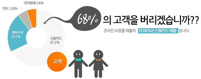 68%는 온라인 결제수단으로 안전한 신용카드 결제를 선택합니다.