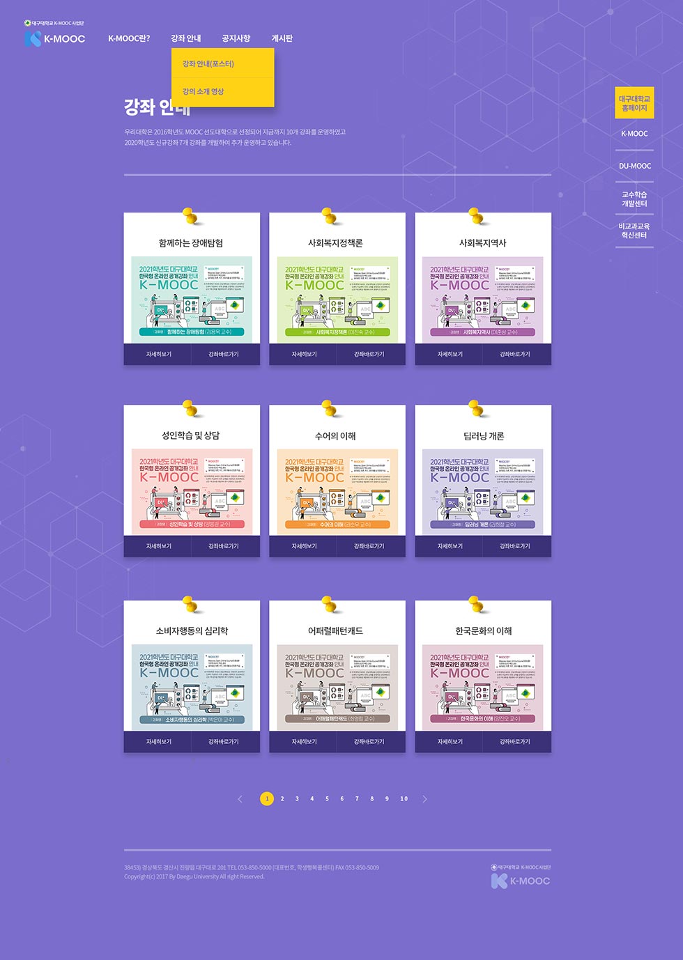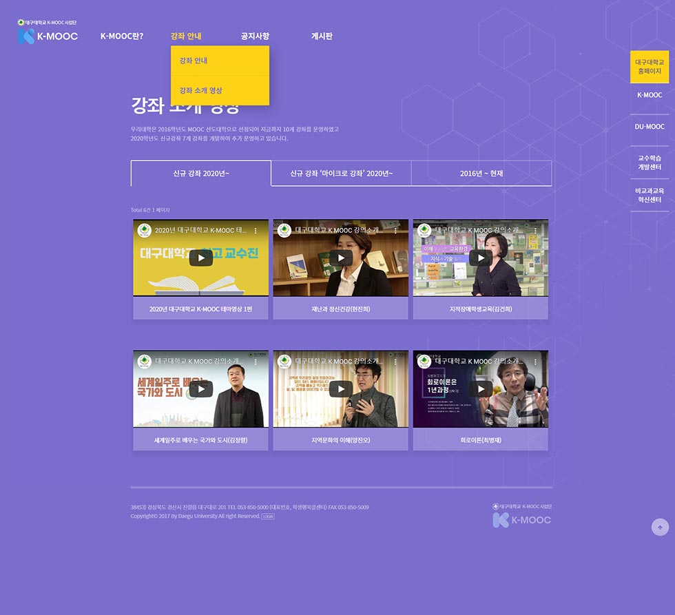 대구대학교는 2016학년도 MOOC 선도대학으로 선정되어 지금까지 10개 강좌를 운영하였고,