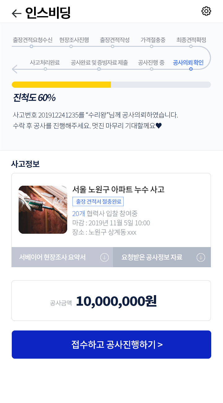 보험사/손해사정법인/수리업체와 같은 특정고객을 대상으로 누수와 같은 일상생활 배상을 PC Web & Mobile App이란 오픈 된 공간에서 ①최적의 수리업체 선정 ②현장방문 견적업무 대행 ③피해재물 수리 진행 하도록 제반 업무를 지원합니다.
