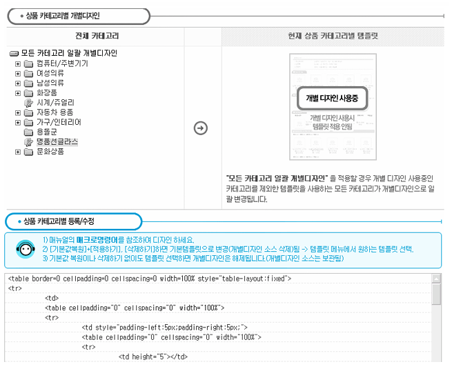 쇼핑몰의 거의 모든 페이지를 직접 편리하게 개별 디자인이 가능합니다.