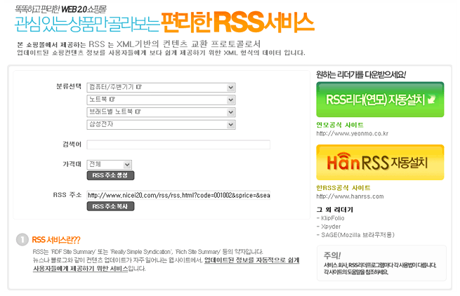 관심있는 쇼핑몰 카테고리/검색어/가격 등의 갱신정보를 직접 쇼핑몰에 방문하지 않아도 Rss 리더기를 통해 정보를 받아볼 수 있습니다.