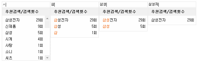 앞 단어만 넣으면 검색어를 자동으로 완성해주고, 추천검색/추천횟수를 알려줍니다.